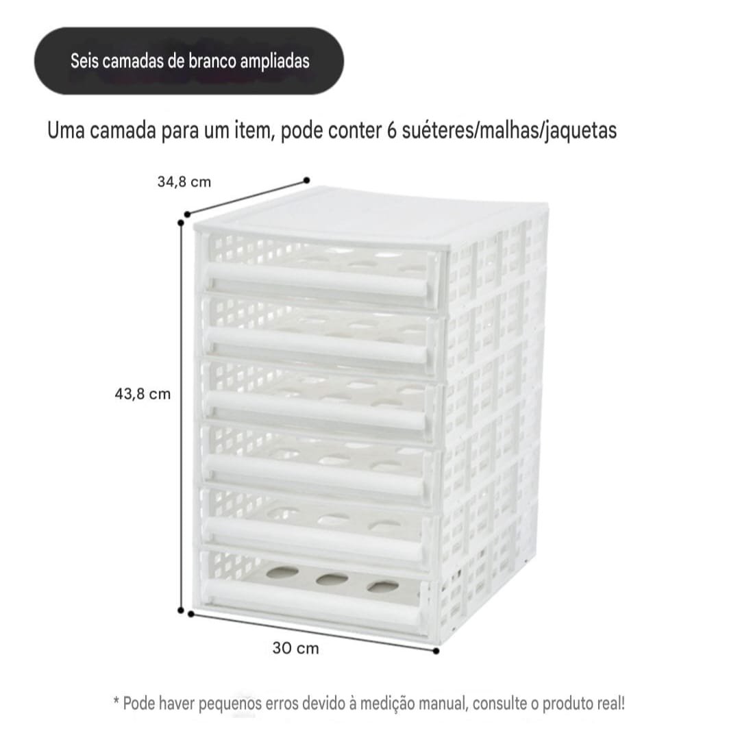 Organizador empilhavel com 6 gavetas para roupas. Cada camada cabe 1 sueter ou jaqueta. Dimensoes: 34,8x30x43,8cm.
